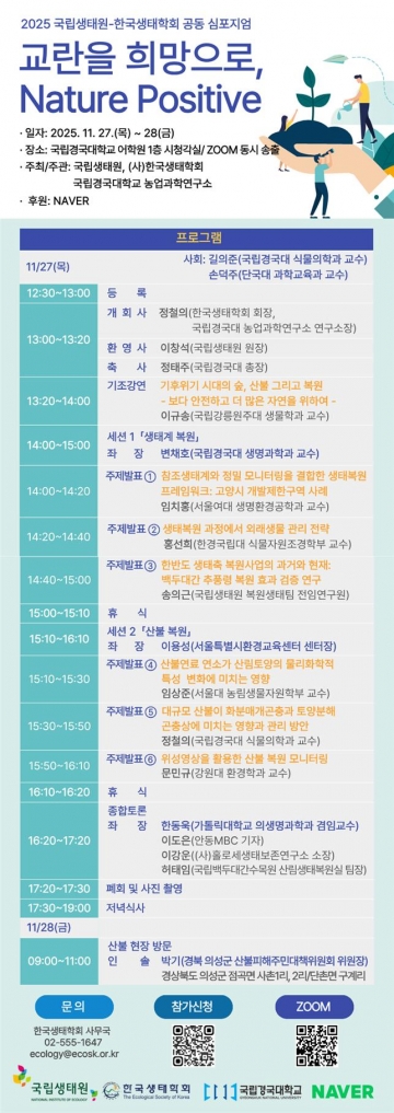 이번 심포지엄은 최근 강력한 산불 등 자연재해가 남긴 생태적 교훈을 재조명하고, 지역사회 회복과 지속 가능한 복원을 위한 자연 기반 해법(Nature-based Solutions)을 모색하기 위해 마련됐다.