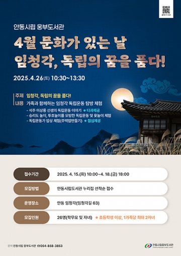 이번 행사는 ‘4월 문화가 있는 날’ 행사의 일환으로, 독립운동의 산실이자 500년 역사를 자랑하는 임청각에서 안동의 독립운동 발자취를 따라가는 가족 탐방으로 진행된다.