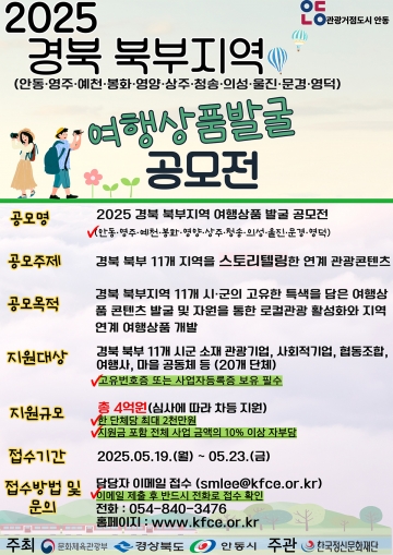 안동시와 한국정신문화재단은 관광거점도시 안동을 비롯한 경북 북부지역 11개 시군(안동, 영주, 예천, 봉화, 영양, 상주, 청송, 의성, 울진, 문경, 영덕)에 숨어있는 여행상품 발굴과 판매를 위한 ‘2025 경북 북부지역 여행상품 발굴 공모전’을 개최한다.
