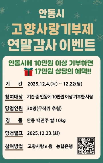 안동시는 연말정산 시즌을 맞아, 고향사랑기부제 참여자에게 감사의 뜻을 전하고 기부 문화를 확산하기 위해 22일까지 ‘안동시 고향사랑기부제 연말 감사 이벤트’를 진행한다고 밝혔다.