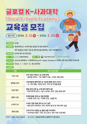 국립경국대학교(총장 정태주)는 기후 위기와 농업 인구 고령화에 대응해 대한민국 사과 산업의 패러다임을 바꿀 ‘글로컬 K-사과대학(Glocal K-Apple Academy)’을 설립하고, 오는 3월 12일부터 제1기 교육생 모집을 시작한다.