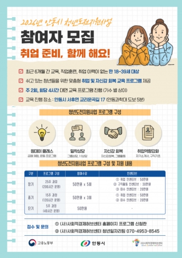 안동시는 취업 준비 과정에서 어려움을 겪거나 구직 활동을 중단한 청년들을 돕기 위한 ‘청년도전지원사업’의 참여자를 모집한다.