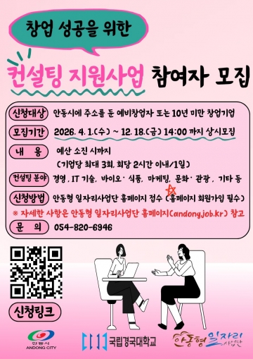 컨설팅 신청은 안동형 일자리 사업단 누리집(www.andongjob.kr)을 통해 가능하며, 자세한 사항은 안동형 일자리 사업단(☎ 054-820-6946)으로 문의하면 된다.